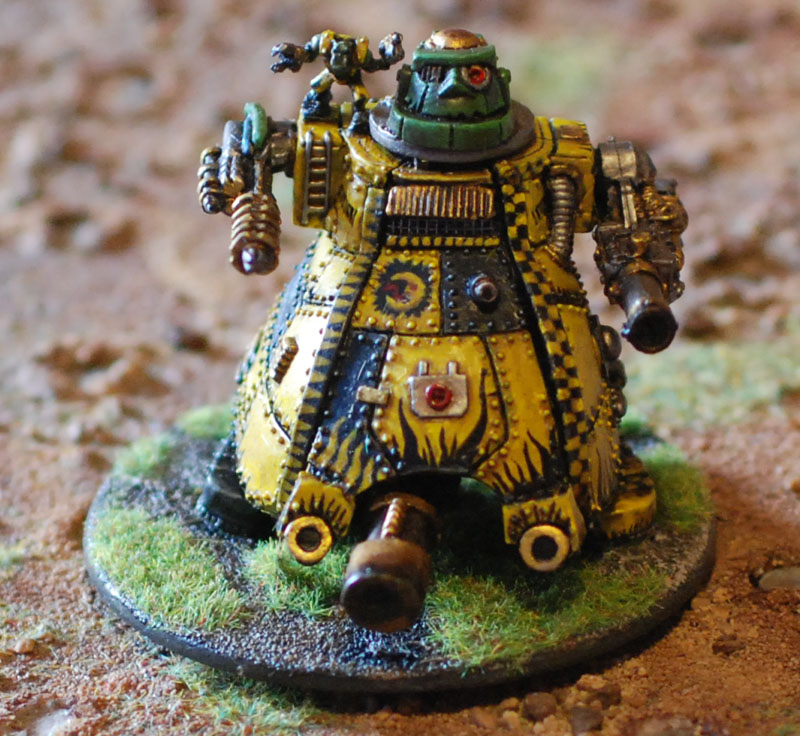 Built after a “donation” of teef from his loyal Boyz mob, Badslug Dakastuff’s personal war machine is “Little Dak Dak!”, a “Zappa” type Gargant. Warboss Dakastuff himself likes to spend battles perched on the Gargant’s broad shoulder, yelling orders to his troops and watching the effects of his Gargant’s oversized weapons on the enemy.