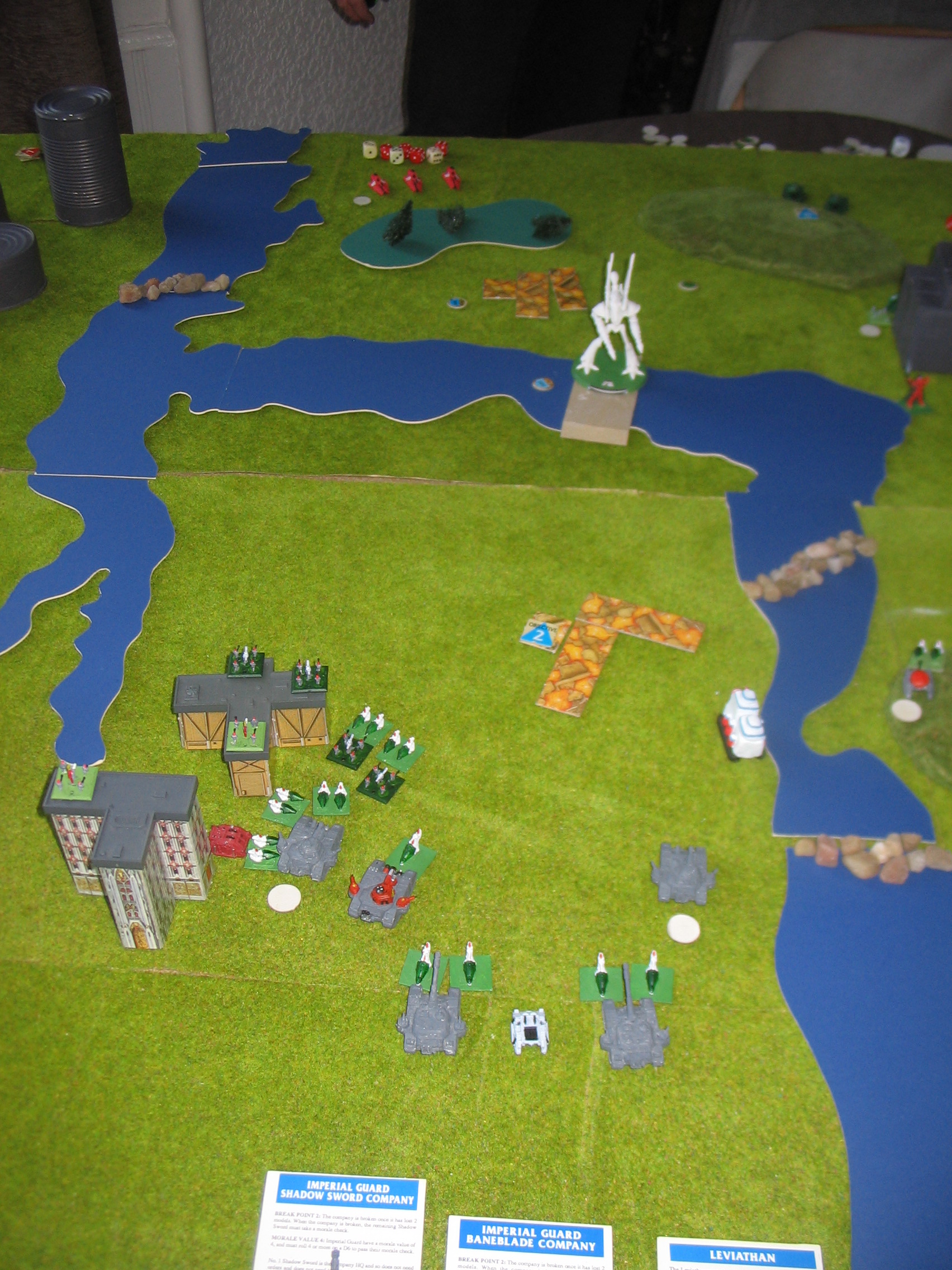 Shadowsword tanks and Tempests exchange fire at opposite ends of the board, while the Eldar titan evades huge amounts of fire from Banebaldes, Predators and the Leviathan. The Tempests take out the Shadowsword's company HQ, causing absolute havok to the IG battle plan. Meanwhile, the Eldar titan's deadly pulsars knocks down all of the Leviathan's shields but the battle-fortresses' armour stands up to the additional shots than strike the hull. Predator tanks punish the Vyper jetbikes who have ventured too far into IG territory, but Tempests take revenge by pummelling the company...
