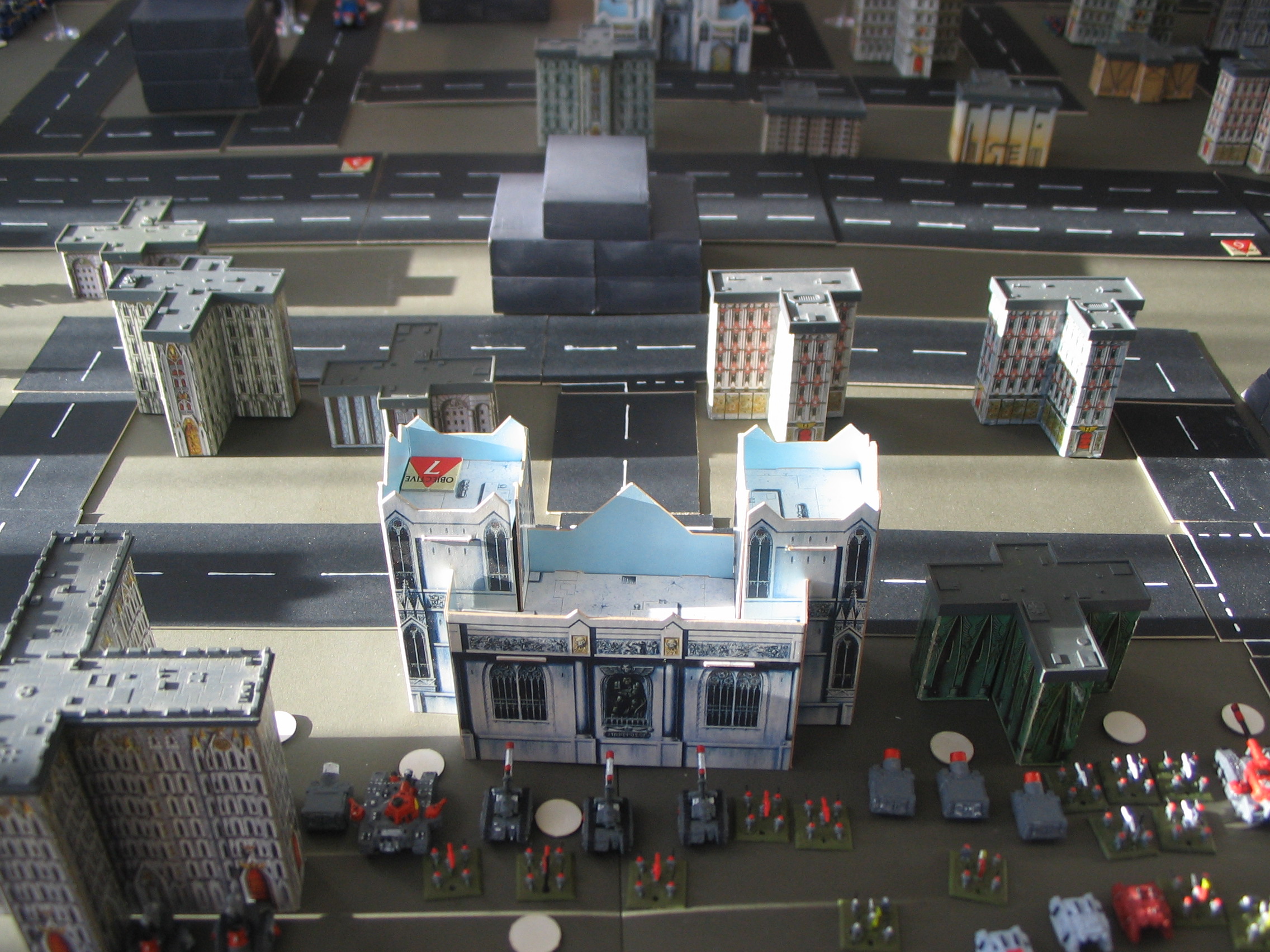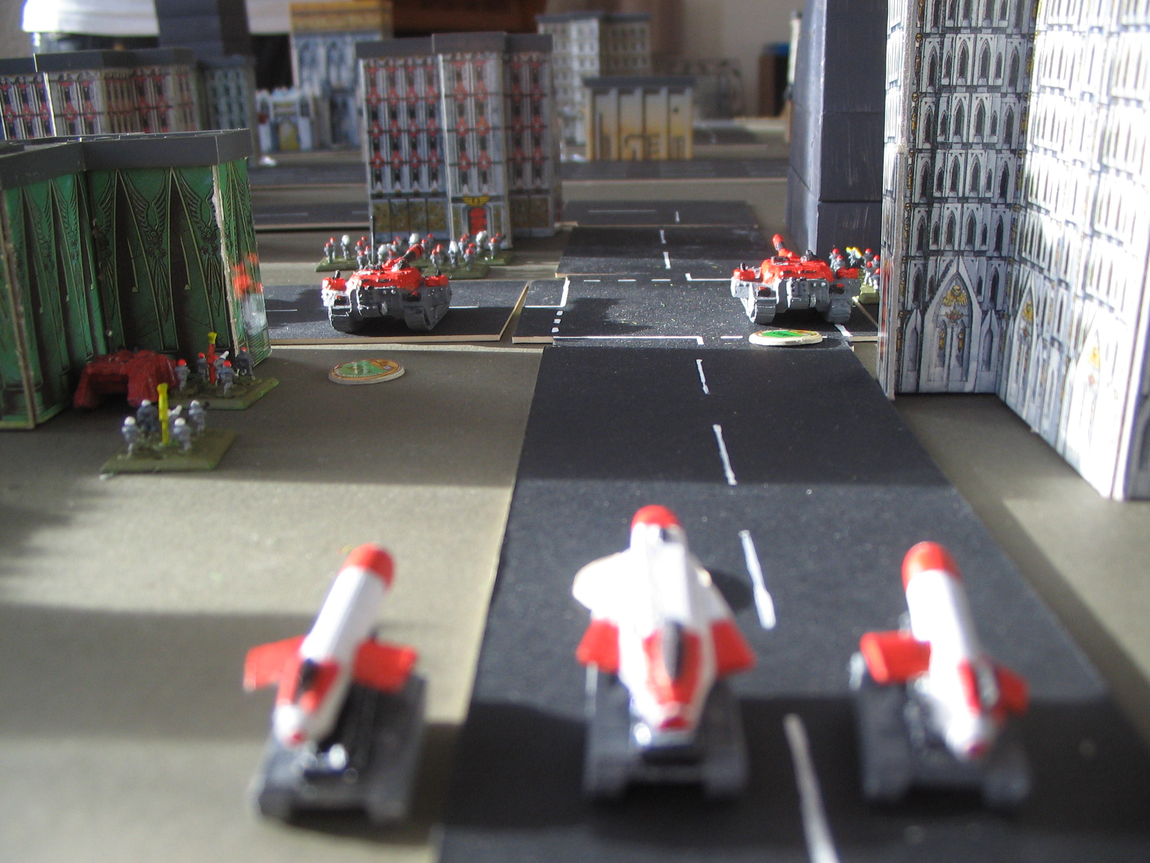 Special Rules: Destroyed vehicles are not removed from the battlefield, wrecks can block movement (nicked from Chroma's EA "Cityfight" scenario).