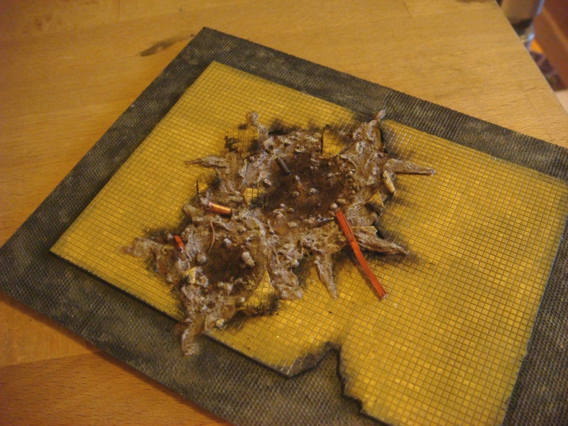 Nice weathering, and painting. Inspiring to see people actually caring about painting scenery. up close the damage looks a bit coarse modelling wise, maybe this will soften with pigments.