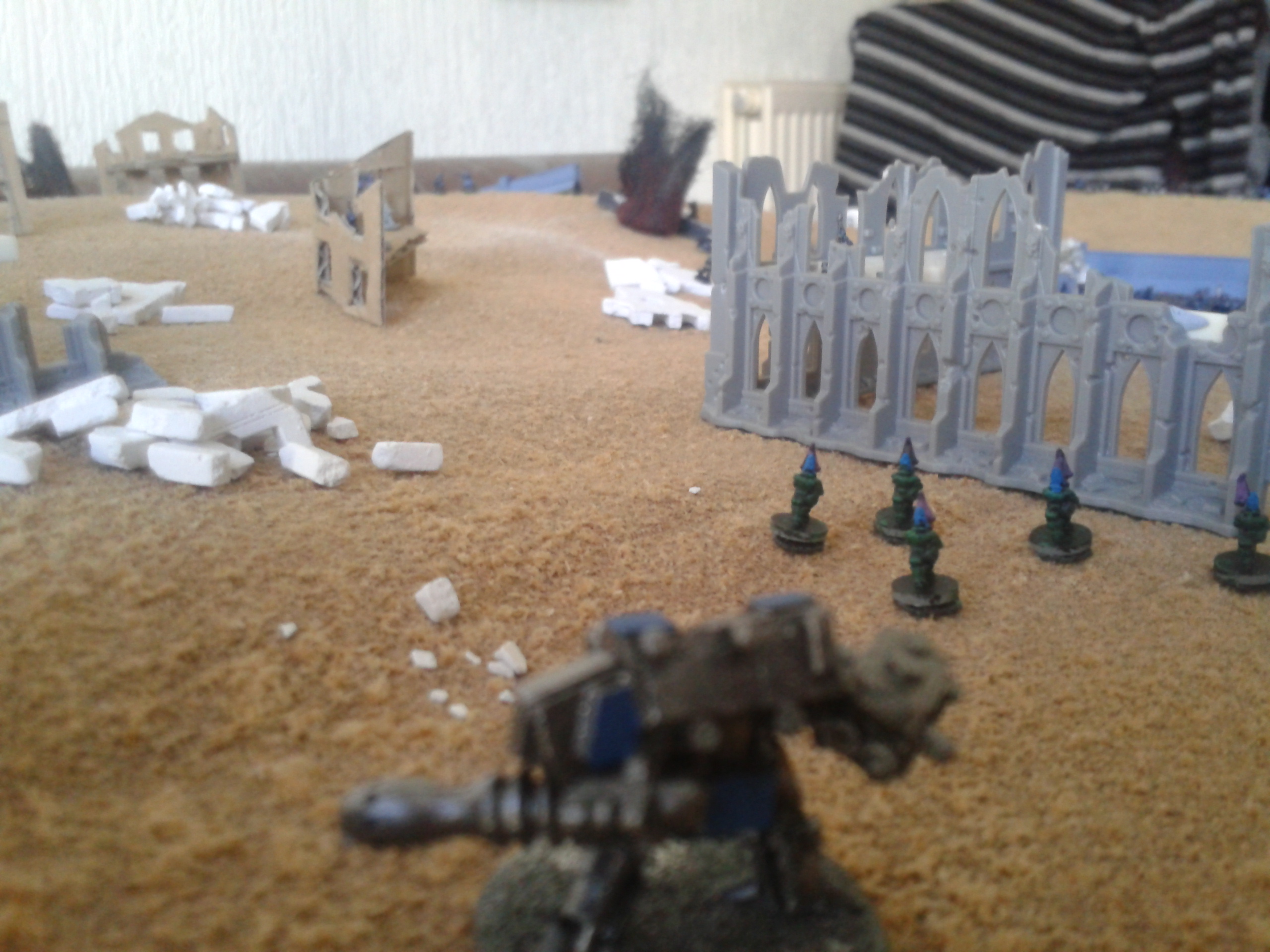 The Basiliks open again, hammering the Mantragan whilst it was distracted with the infantry. The infantry are destroyed in the blast, with the crew's reluctance to follow the friendly fire orders overcome by the presence of the commissar in the nearby command squad. The heavy bolters spray shells into the smoke and dust, with the fire altogether resulting in damage to the ammo feed of the twin-linked autocannon in addition to stabiliser damage. The consequence being that the pilot loses control of the walker. The malfunction soon proves to be less of a concern following the subsequent destruction of the machine after a second barrage.