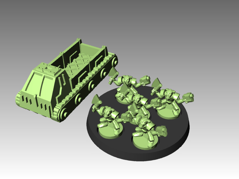 Nice! Men seem a bit under equipped for grim dark standards. Infantry vehicle looks good too. A bit crude here and there, e.g. the driver viewport lacks a slit and the aft gun ports look a bit strange. No rivets? Is simplicity like this maybe a requirement of plastics?
