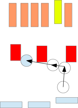 Blue units, including a WE, is engaging an orange formation of unarmoured infantry, screened by red armour. The yellow infantry units is a particularly valuable target (say, a commander) and is positioned a little behind the others to minimize the number of allocated hits.