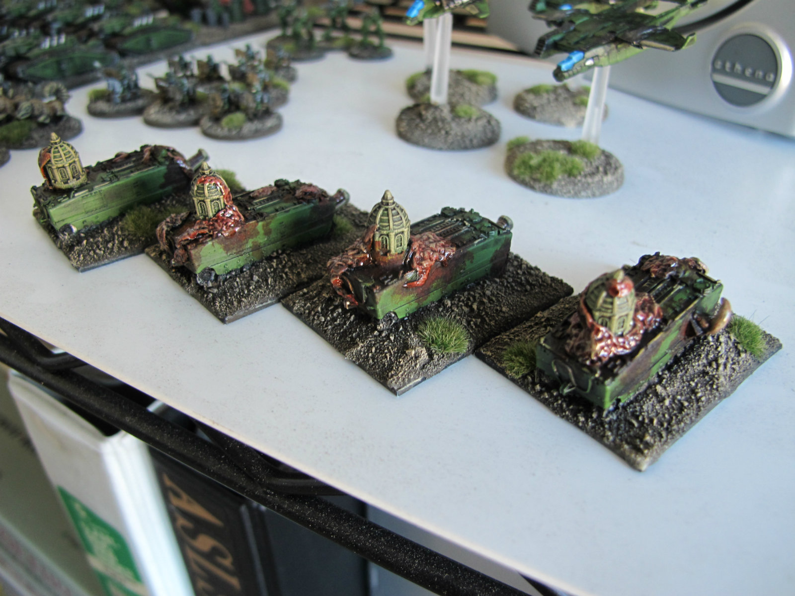 I picked up some micro armor transports (i forget the model), then filed off the top and added the little cathedral towers from DW tanks. The guns in front are veeeery old eldar lasguns cut down and drilled.