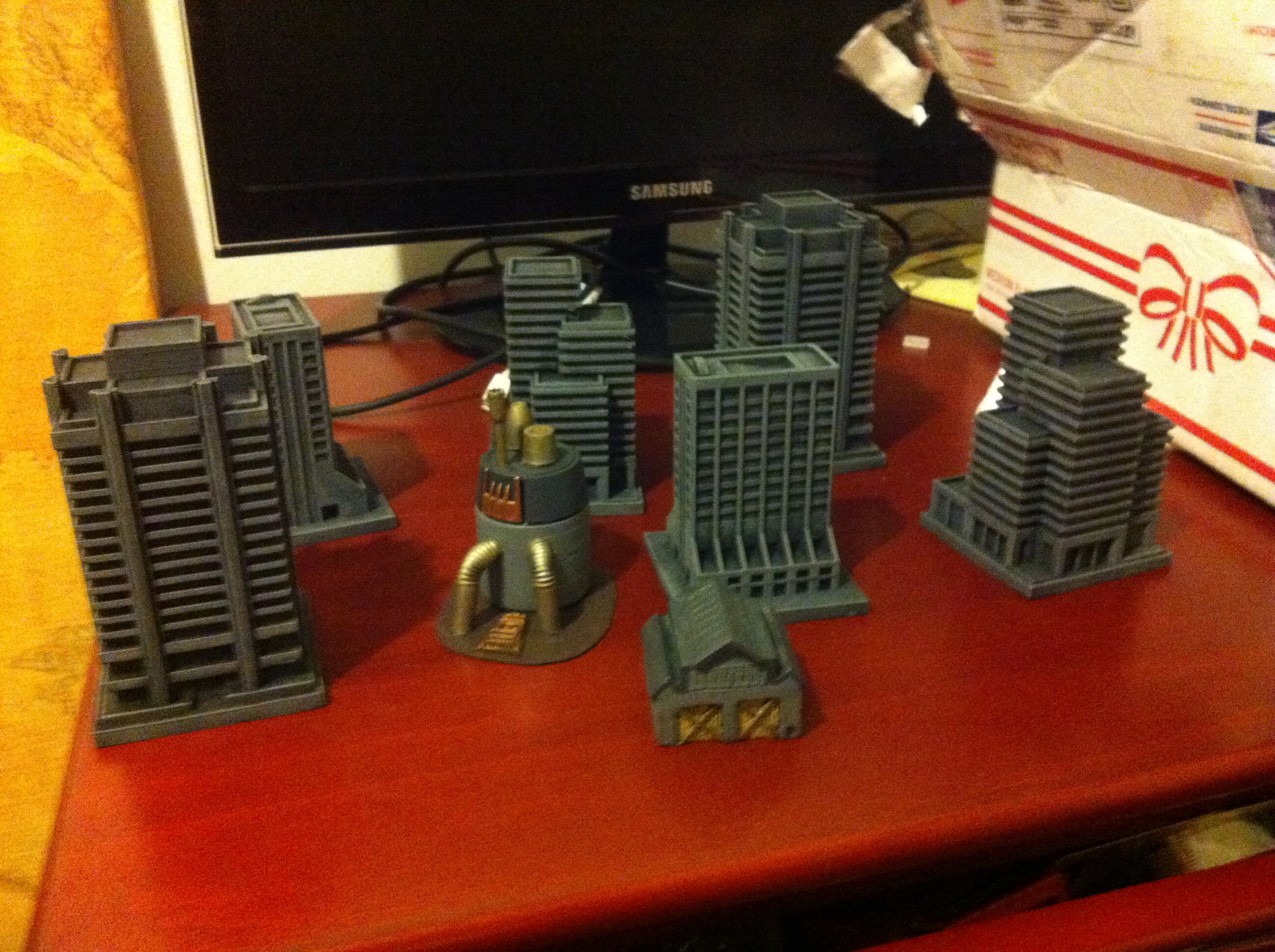 I was blown away by those buildings and they make the table look great. I basically harassed a fellow player in my group into printing off another set for me :) So far I just dry brushed them grey. Considering battle damage and or imperial icons / banners to make them look a tad more 40k.