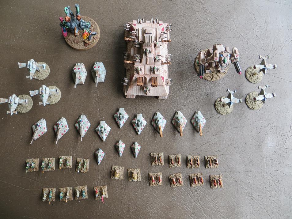impressing forces you have. Where are those large battleships from? BFG ships are tiny next to them.. Are those zoats custom minis or ??