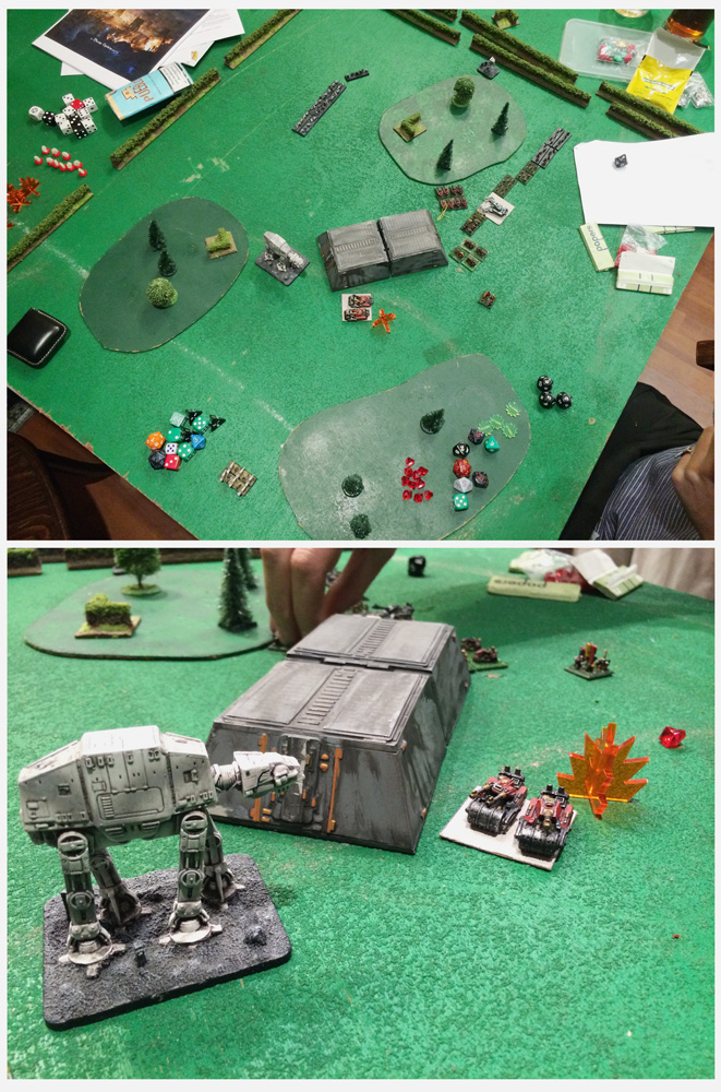 Was a good game, though Lady luck was definitely in my favour this time round! In the 2nd turn my warbike cavalry hit the AT-AT(Giant), killing him in a single blow when Mr Gonzo opted to danger roll and rolled a 10. Following that, Mr Gonzo sent his Behemoth AT-ST’s to attack my weak flank with the Gretchin, only for the Gretchin(CQ20) to wipe them out, rolling a 1 and a 2 in consecutive combats!
