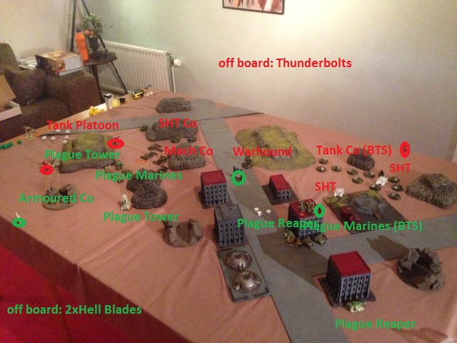 I set my 2 plague towers watching over my blitz and the left flank. The rest of the forces where pretty evenly spread out.