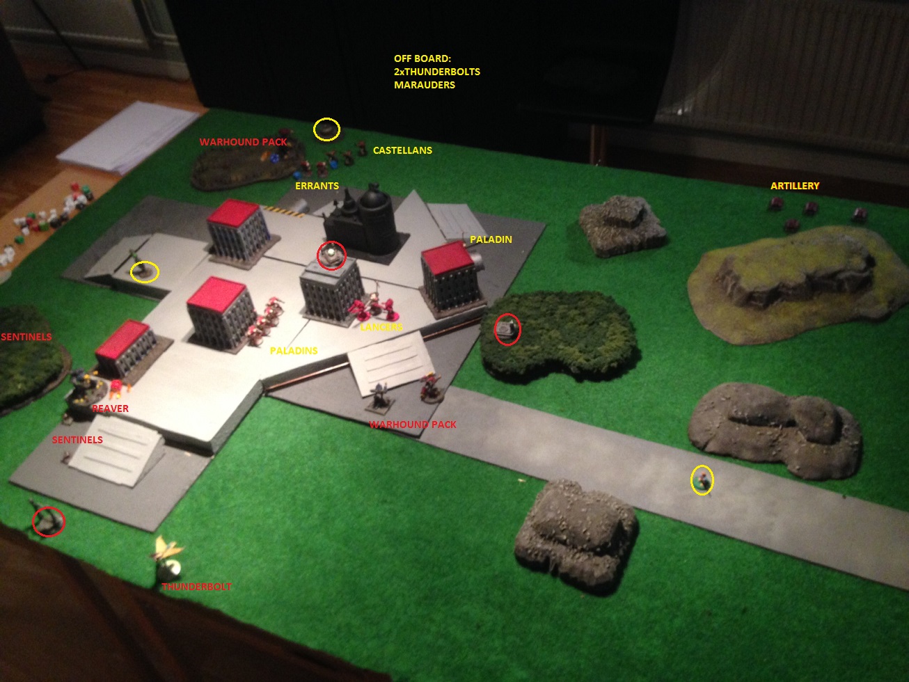 T: sentinels doubles into city and fires on lancers doing 1DC! T: warhounds retain and engages the lancers. They wipe out the formation, claiming the BTS objective, foronly the loss of their shields. K: errants sustain on warhounds in forest by knight blitzfor1BM K: castellans retains and sustain on the same warhounds, stripping 1 shield and breaking the formation. T: BTs-reaver advances and fires on paladins, killing 2 and breaking the formation K: lone paladin doubles and fires on warhounds in centre for 1 BM T: sentinels on left flank doubles theu forest and fires on broken paladins . 1DC is made due to BM placing. K: thunderboltsground attacks BTS-reaver for 1DC (2BM). Intercepting thunderbolts shots at them but their armour holds up. K: artillery sustains on BTs-reaver for 1BMand breaks it. K: thunderbolts ground attack broken reaver with the help of their SC. Nothing happens K: lone marauder ground attacks broken reaver and finally destroys it! Te Knights claim the BTs objective.