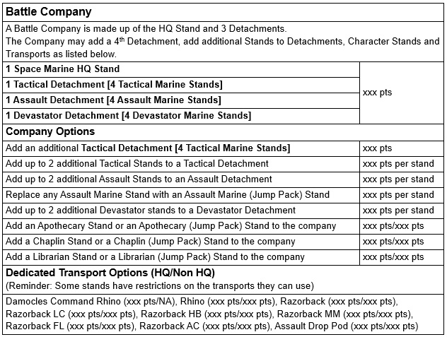 The only changes would be to allow variable formation sizes like what I have been doing with Marines, allowing characters as upgrades to formations rather than separate cards (the minor ones), allowing formations to take a selection of transports and putting all the stats through the points calculator.