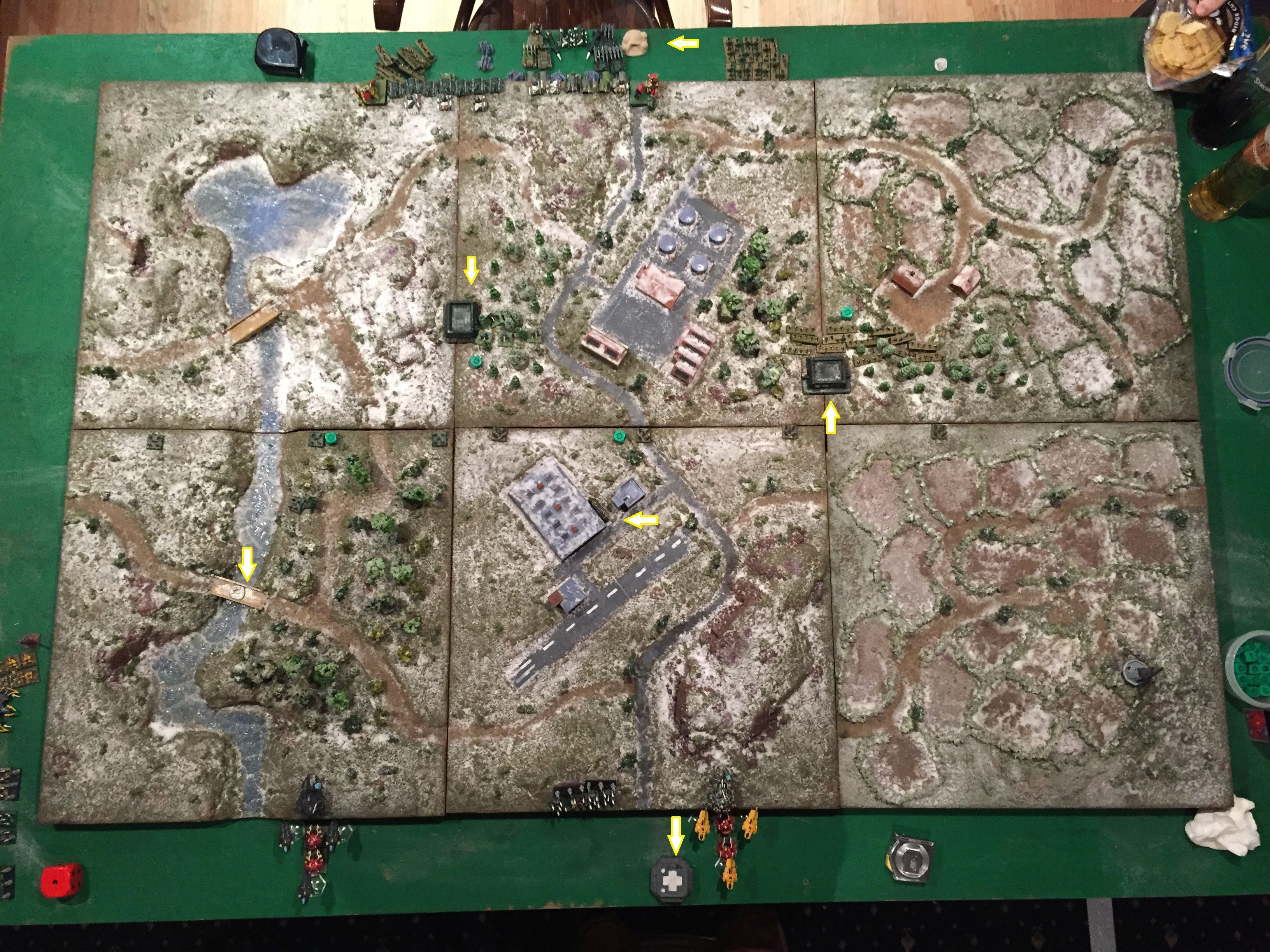 The start of the game. Objectives are identified by yellow arrows, the IG are deployed at the top of the photo, the Iyanden at the bottom.