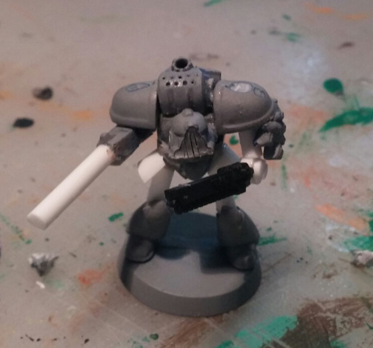 The tools and material. One badly primed plastic space marine, a 1/8” (32mm) plastic rod, also forgot that you need something choppy, for this one I used an imperial guard chainsword.