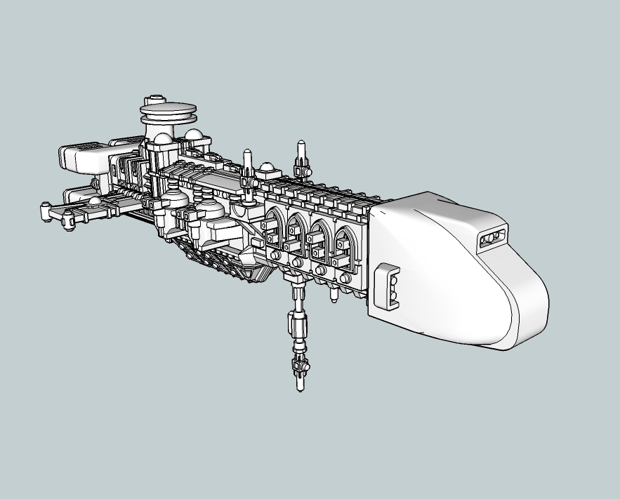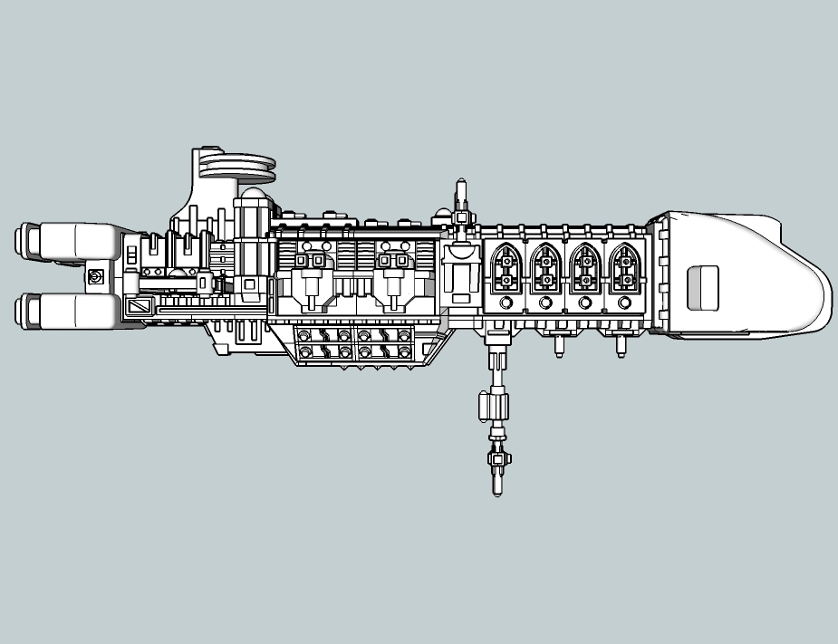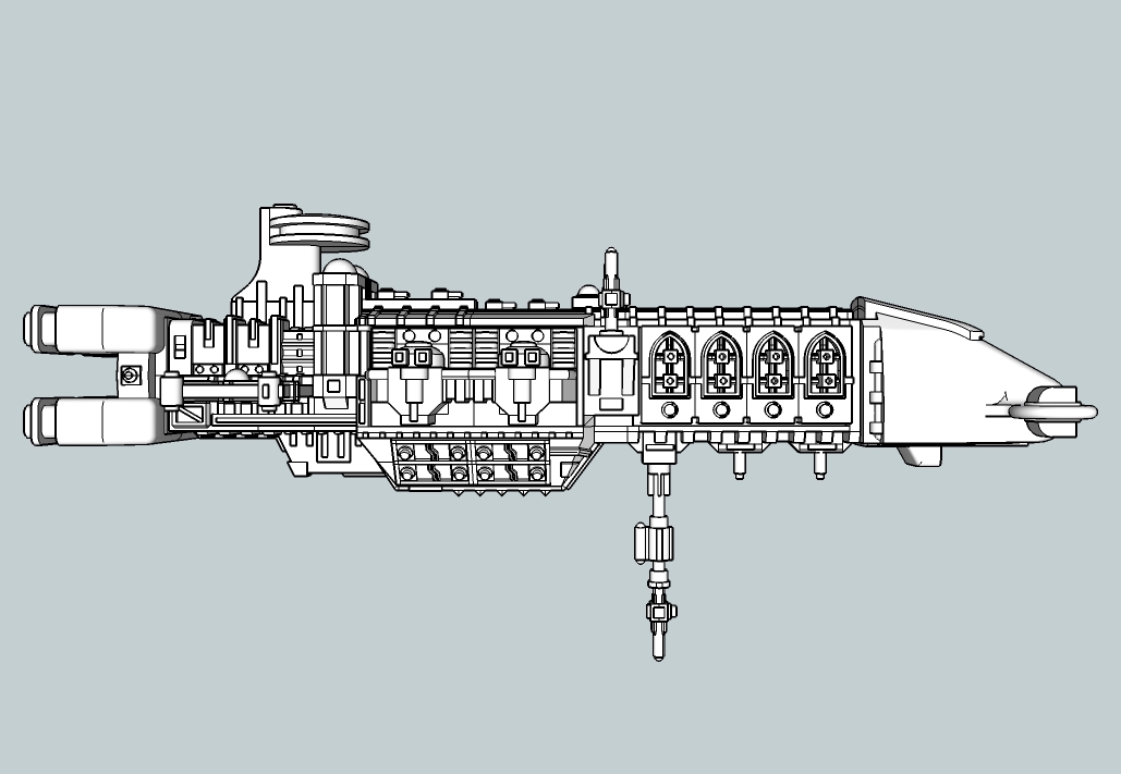 Starting from a standard space merchant Lunar, I've changed the prow, the lance batteries, the engines and the bridge; the biggest challenge was giving the prow a rounded tauish shape, without making it look like something rated R...