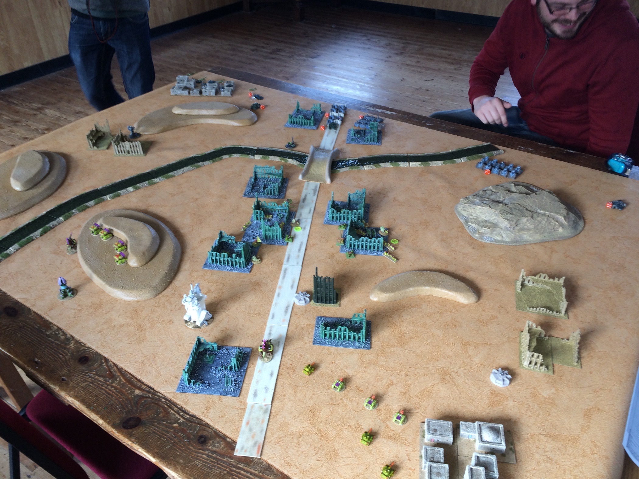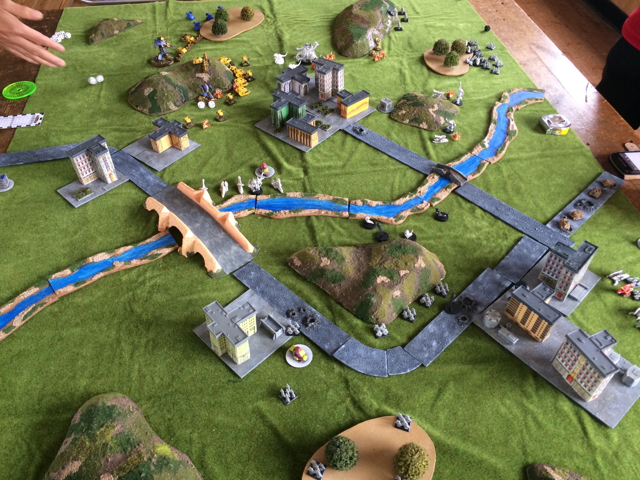 I forgot to take a photo, so this one shows the previous game of Nids v Marines. I deployed on the left side of the photo and placed the far side objectives around the hill in the foreground of the photo, Blip was on the right side and placed his two far side objectives around the hill at the back of the photo, the one surrounded by yellow Marines, clearly aiming for a position where the Warlock Titan could take both of them. My Contagion Engines garrisoned behind that hill, the big Retinue in the central city and the smaller SC Retinue in the city in the middle of my table side. The Warlock Titan went in the middle of the Eldar deployment zone near the Aspect Host and the Night Spinners and Guardians were off on my right flank behind The city bottom-right in the photo, with a screen of Rangers up on the halfway line.