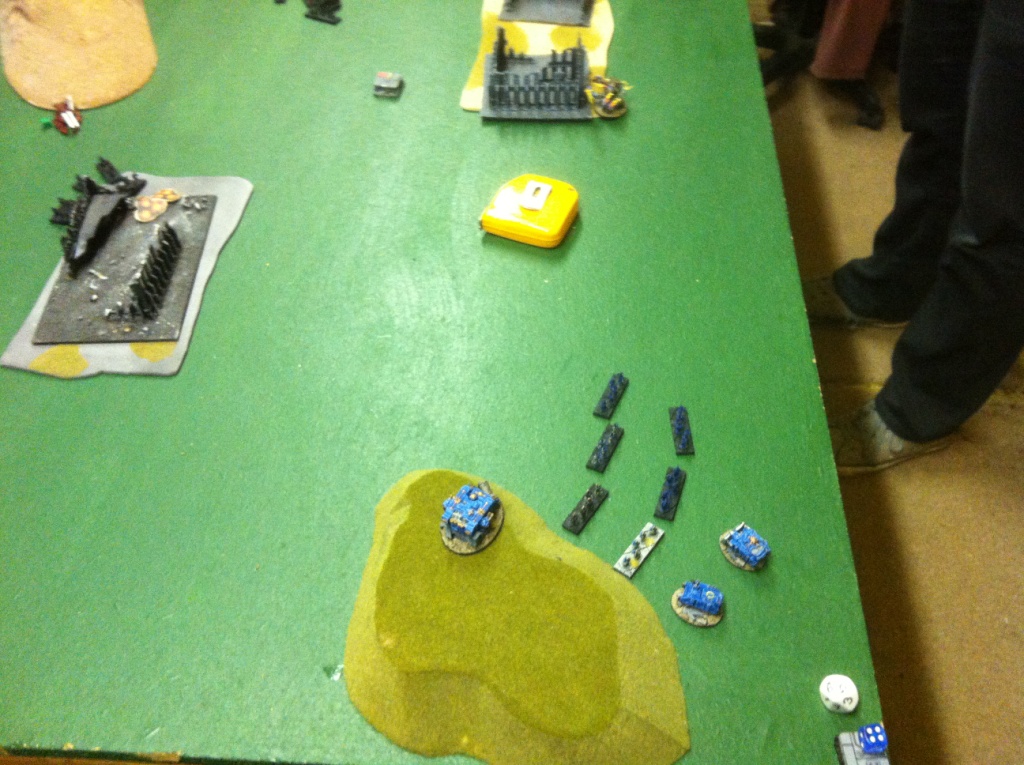 SH – Hornets (3) double with the SC re-roll and fire on the Armoured Company, 3 hits, Predator fails and the formation breaks back to deployment zone.