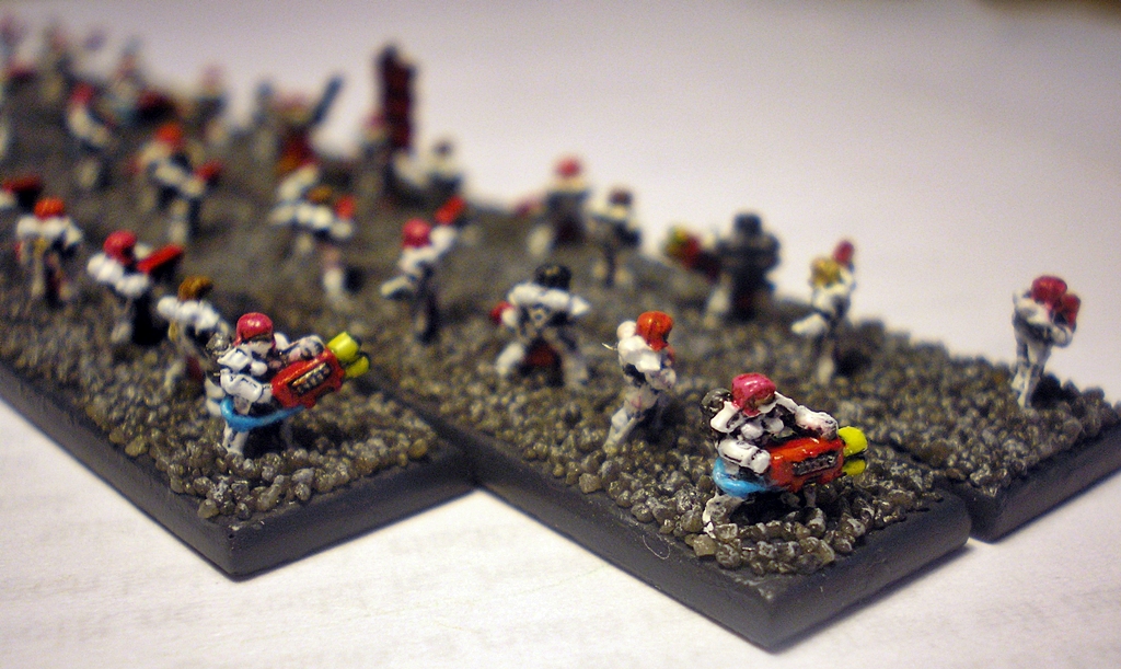 I prefer the manga/anime look of the Onslaught minis, so I want to use a bit more color on them (like the strong light blue on the Flamers, etc). This means, I need a "boring" basing scheme (a gray one, like this), but I'm not satisfied with a base this simple.. And also some 10/15mm Medieval decals are still missing (for the banner, etc).