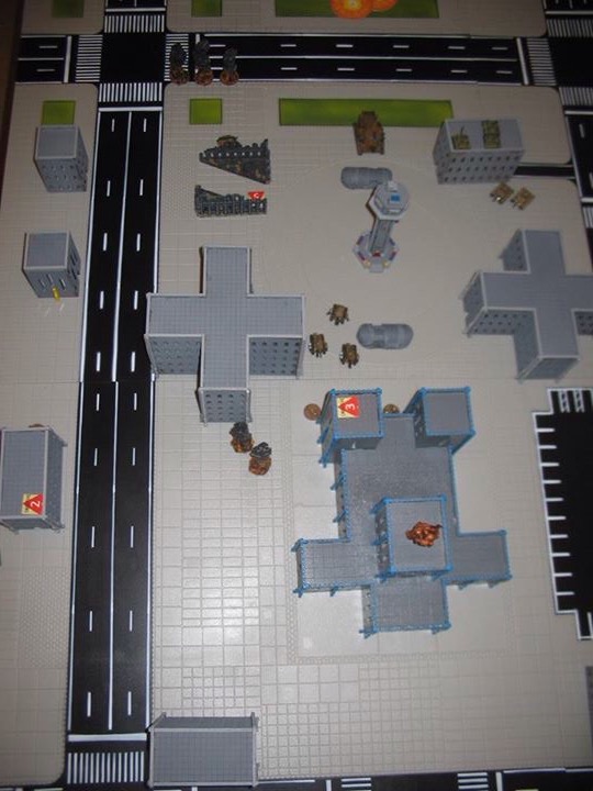 The battle was fought on city terrain (J4 on Campaign Map). The Squat army was on Fortify orders and the IG on Advance. The Squats can Place 450 points of defences built in a previous campaign turn anywhere on their half of the board. Both armies set up within the usual standard deployment zone although the entire Squat army has to deploy before the IG do.