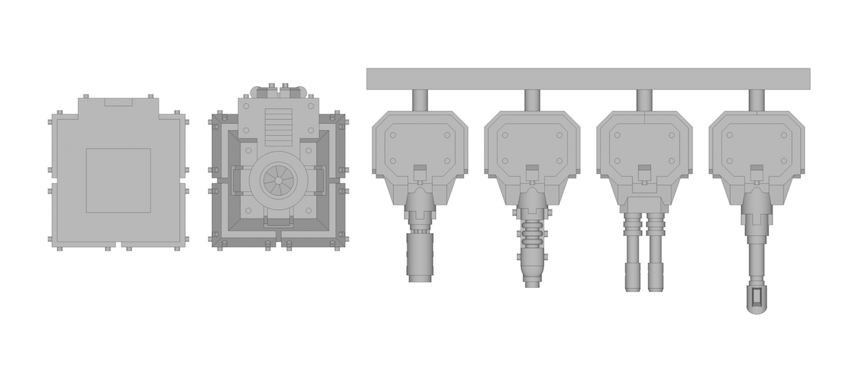 -"Oddities Sprue" (standard hull): quad automatic cannons, light battle cannon, multiple laser cannon with multiple missile launchers, heavy laser cannon, medical transport