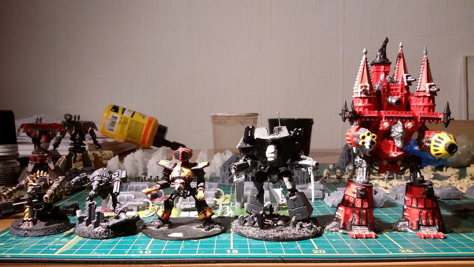 I ended up measuring the rest of them for future reference: (no bases included, thin base would be 1mm, thick 25mm base 4mm) Old GW Warhound 33,5mm to top, 37,7mm with spikes New GW Warhound 38,3mm Old GW Reaver 46mm to top, 54,3mm with rocket launcher on top, depends on the weapon New GW Warlord 65,7mm to lower shoulder top, 69,3mm to upper shouler top (not weapon top) Imperator 81mm to platform top, 104mm to cupola top, 129mm total with towers
