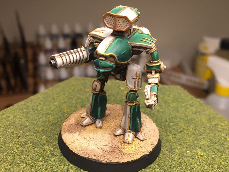 First "Reaver" proxy at 3mm scale - a preview Dreadnought Stalker from Vanguard, leading off the Legio Ultor. Green, Ivory and Gold, Loyalist colors, were my choice for this, mainly because they're all very difficult colors I wanted to get better with. Plus their home planet, I decided, is Venus, so these colors seemed appropriate. A bit of a challenge but I'm happy with the outcome!