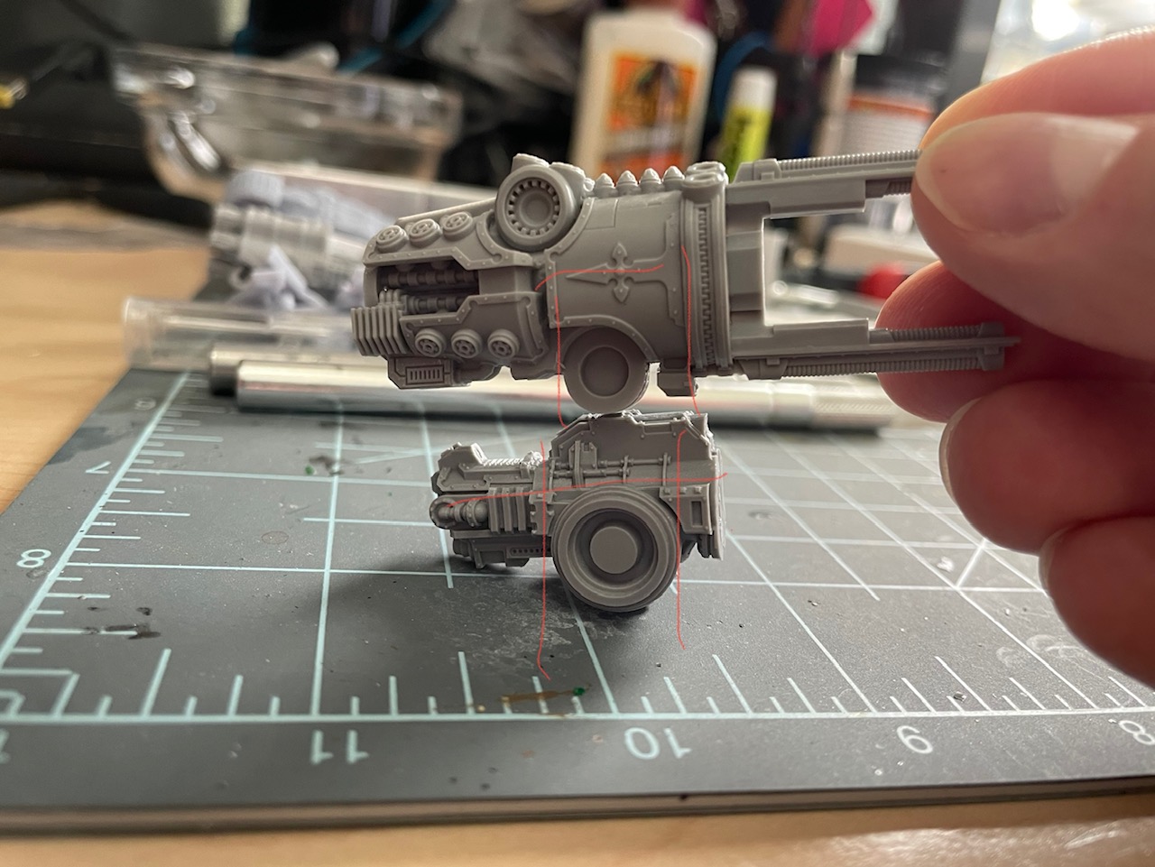 Finally, my current project is (still) converting a Warlord conversion beamer to fit on a Warbringer carapace mount. Finished cutting out portions of the old weapon, fitting the mounting point, backfilling everything I'd cut out around the mount, and building the trim back up with styrene & greenstuff. Once the trim greenstuff cures, it's all going to get a light sand & a filler layer of liquid greenstuff to smooth things out, and then I get to experiment with N-scale resin rivet decals!