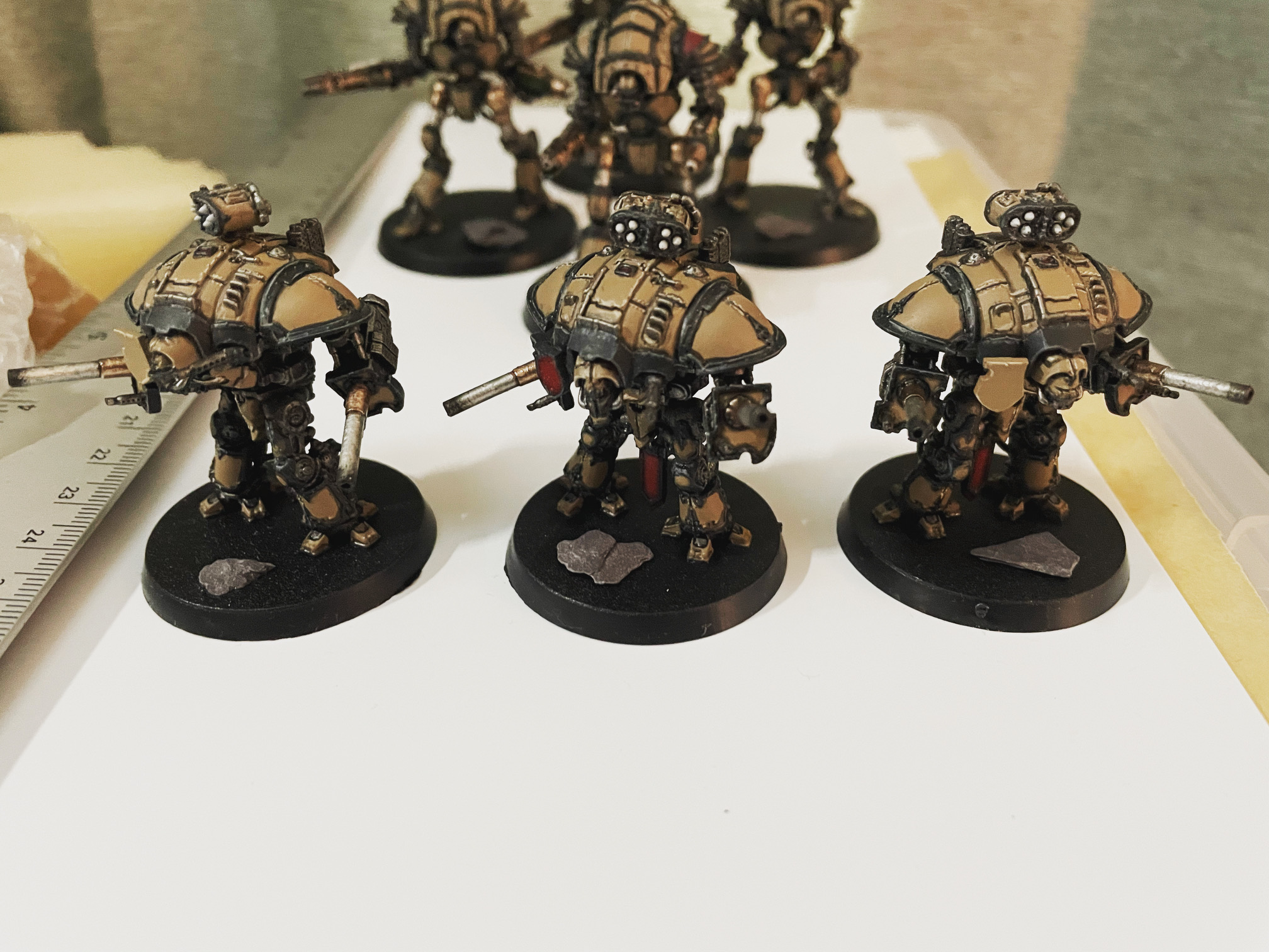 I finished up another seven knights for AT/LI, three more Questoris chassis and a quartet of Cerastus Atropos. Haven't been able to set up a fancy backdrop for photography, so here's everybody on my painting table: